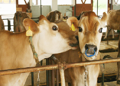 牧歌の里では、約30頭のジャージー牛を飼育していています。毎日、午前5時と午後4時の乳搾りで採れるミルクは、飲用や乳製品の原料として出荷されています。頭のジャージー牛から出る乳量は少なめで年間4500kg程。現在、国内では12,000頭が飼育されているといわれています。