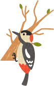 木ぼっくりミュージアム前の林で木をつついている音が聞こえます。赤・黒・白が印象的なキツツキです。園内に時々落ちている羽もおしゃれ。
