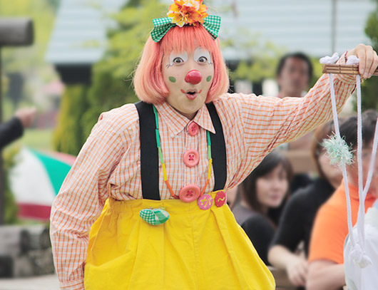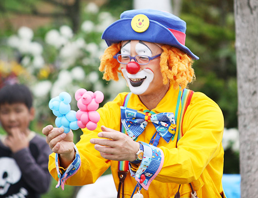 芝生広場の特設ステージで、クラウンが得意のパフォーマンスで楽しませてくれます。