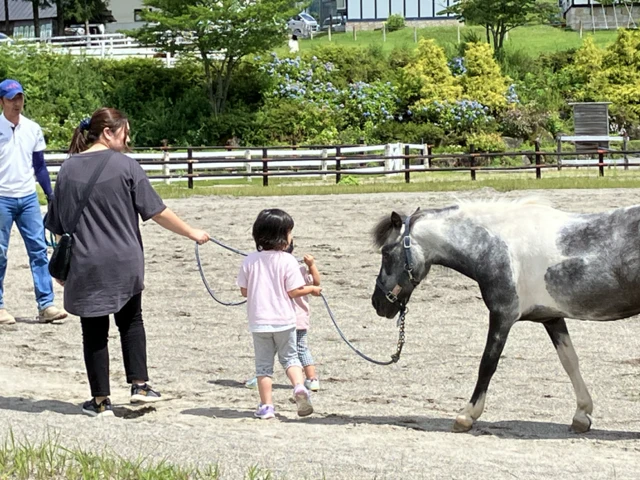 大人しいお馬さんをスタッフがゆっくりと引いて歩きます。乗馬した後で、乗った馬の「名刺」がもらえるので馬の名前も覚えてあげてね。 ※身長110㎝未満のお子様は親子乗りができます。 ※天候により中止の場合があります。