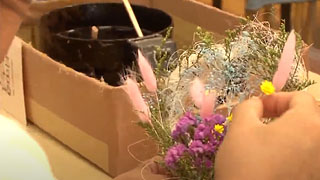 ドライフラワーやリボン、可愛い小鳥を使ってのリース作りです。