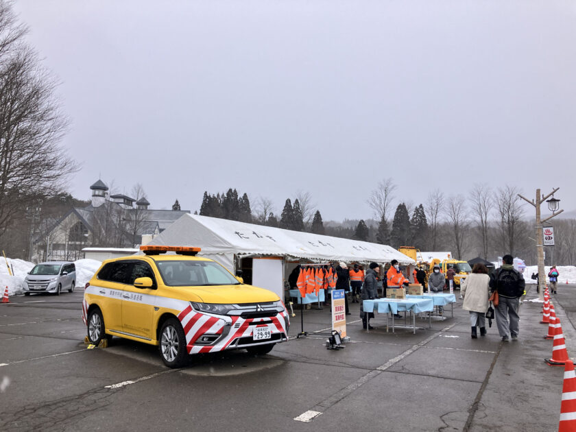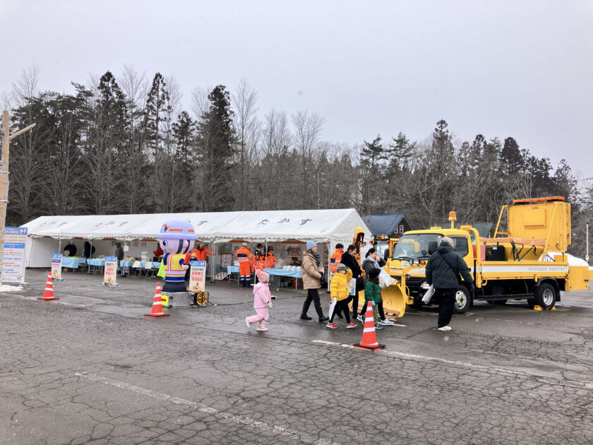 雪まつりのNEXCO中日本のブースでは、働く車好きにはたまらない!高速道路パトロールカー(通称:黄パト)がやってきてくれましたよ〜!。パトロール隊のコスプレで記念撮影もできます♪(画像は2月7日)